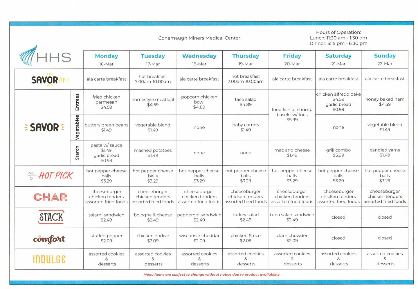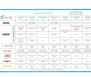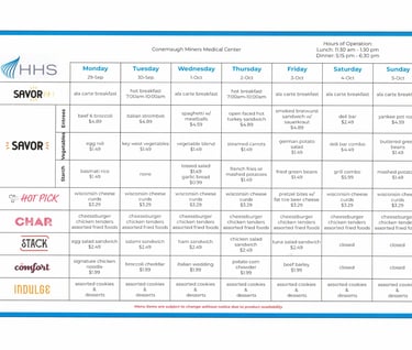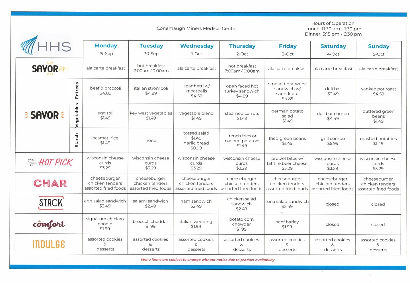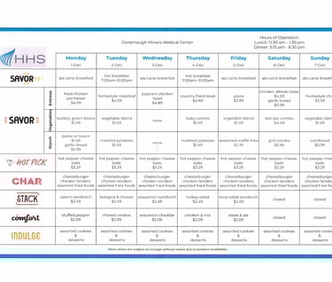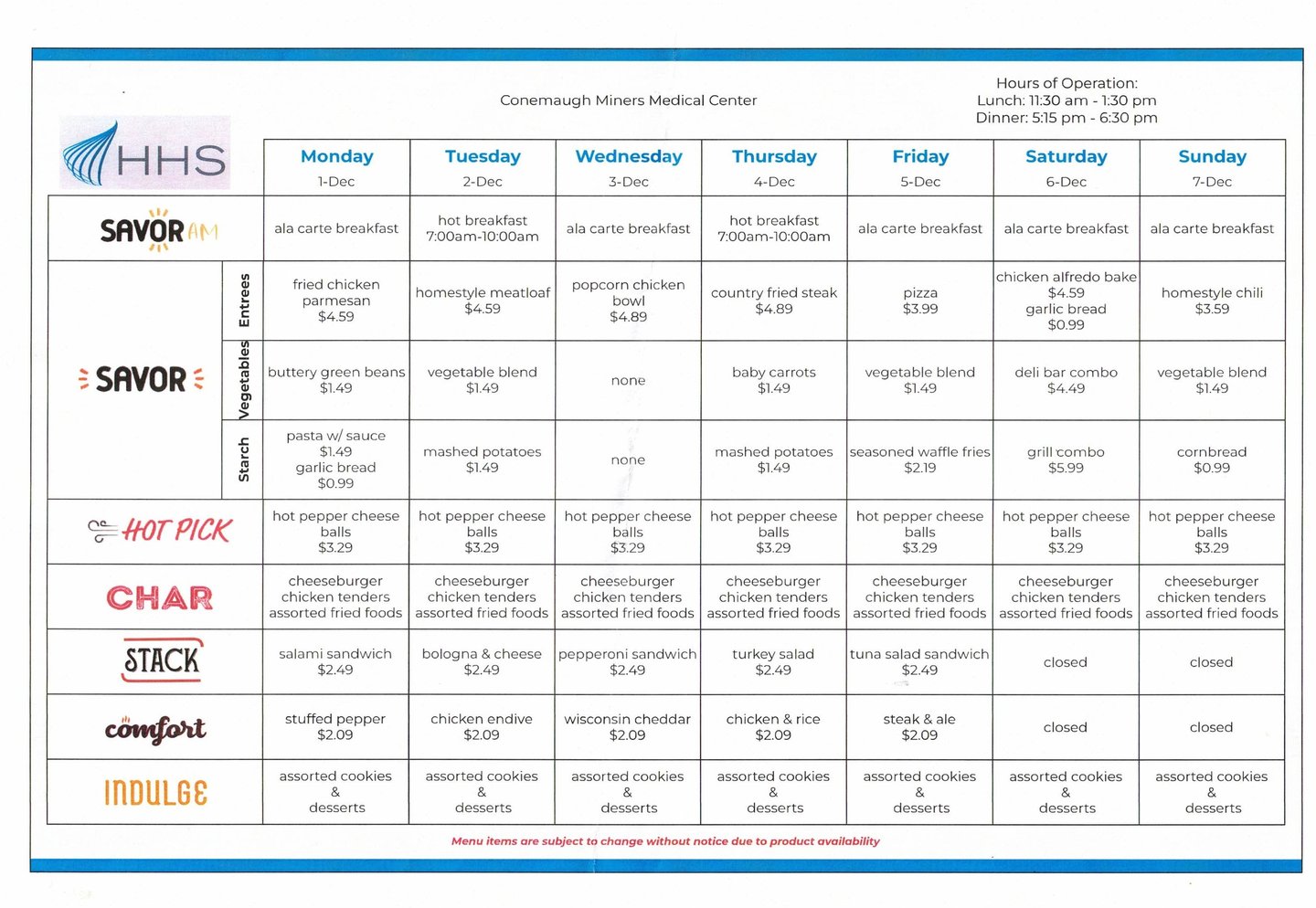 The Menu for Conemaugh Miners Medical Center in Hastings, PA
